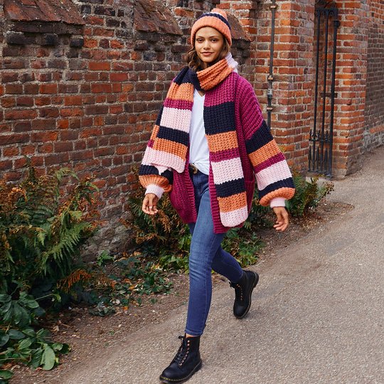 A unique twist of pinks, blues and khaki tones in a chunky fisherman knit make up the crown of the hat, while the bouncy pom pom and wide rib hem are a contrasting pale pink.